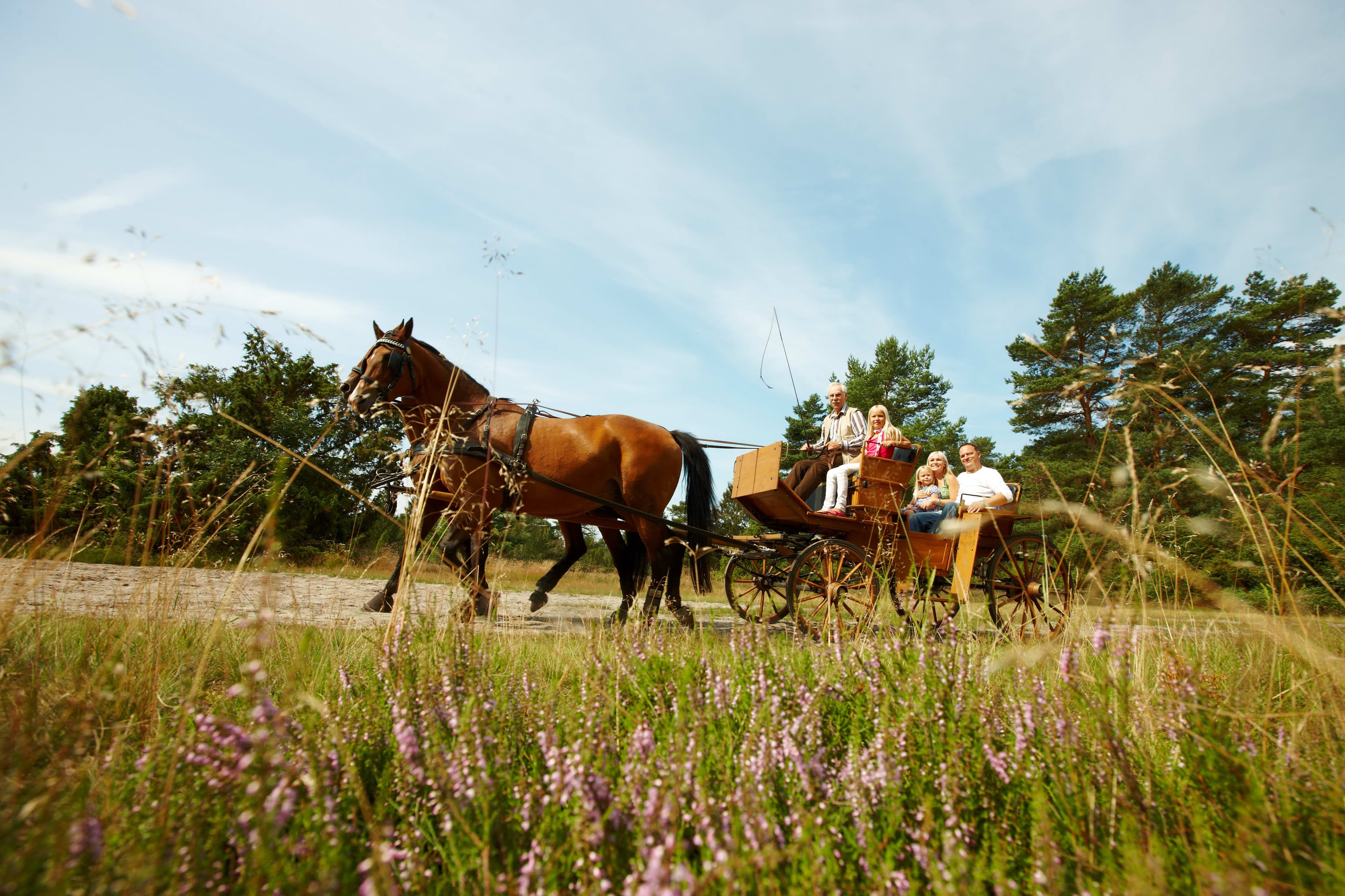 - Um Etappen auszusparen, lassen sich so manche Wegstrecken auch mit einer Kutsche oder dem kostenfreien Heideshuttle (Juli-Oktober) überbrücken. Auch Infos zur Anreise stehen zur Verfügung.