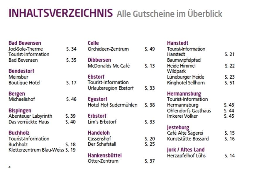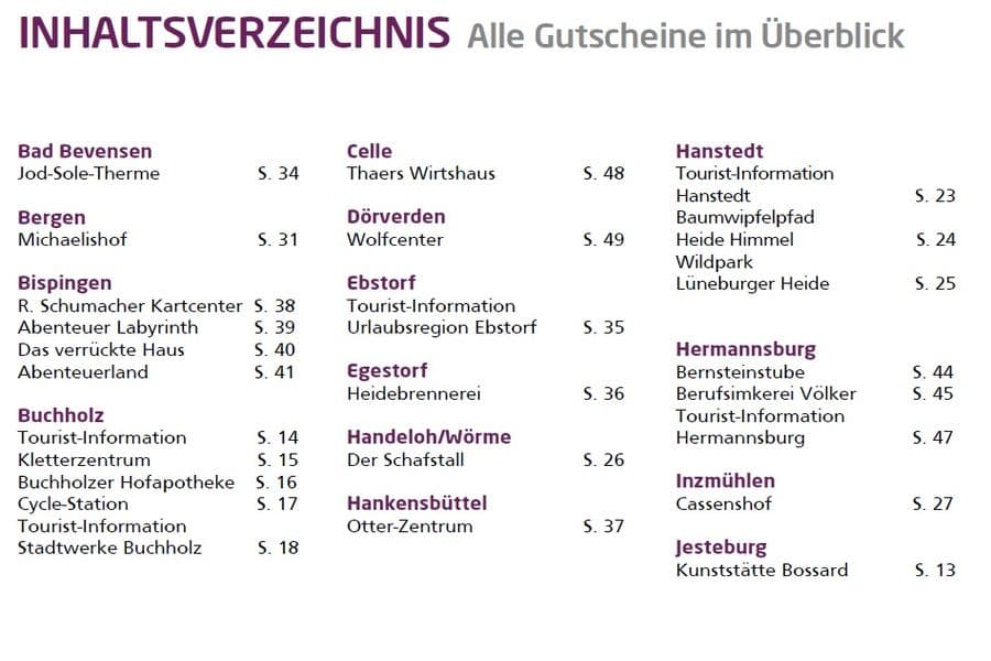 Lassen Sie sich vom Gutscheinheft zu tollen Ausflügen in der Lüneburger Heide inspirieren. Ob Freizeitpark, Stadtführung, Thermenbesuch, romantisches Heidecafé, Hofladen, Museum, Shoppingtour, Spezialitäten-Restaurant oder ein Souvenir für die Lieben daheim, mit Ihrem persönlichen Gutscheinheft erhalten Sie viele Ermäßigungen und Vorteile auf ausgewählte Leistungen.
