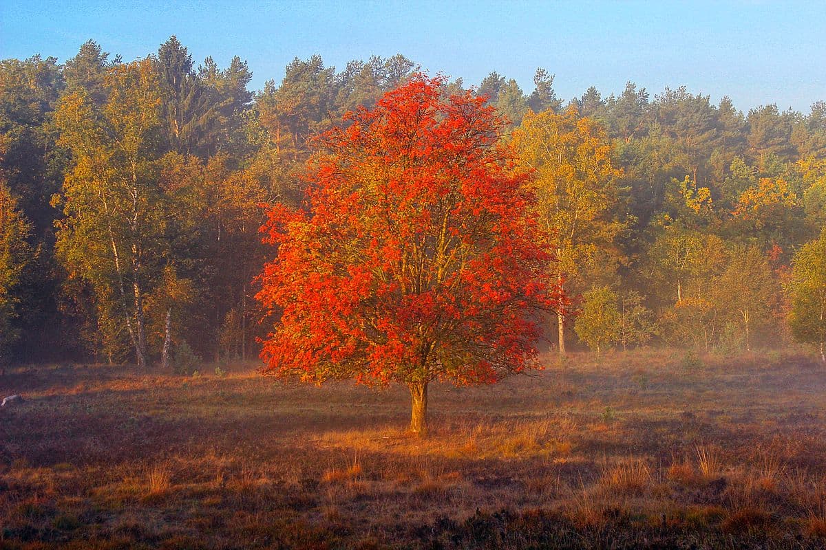 Die Sonne zeigte sich hier erst später, da sie erst über die Bäume am Waldrand klettern musste. Von da an wurde es gleich viel wärmer und einige Bäume begannen rötlich zu leuchten.