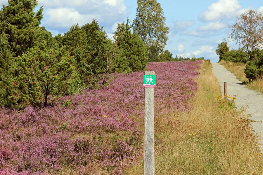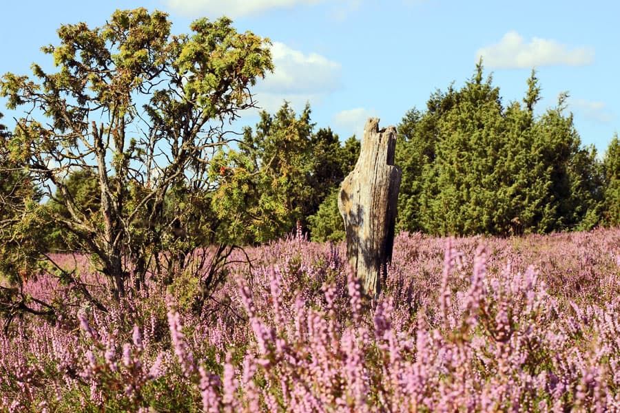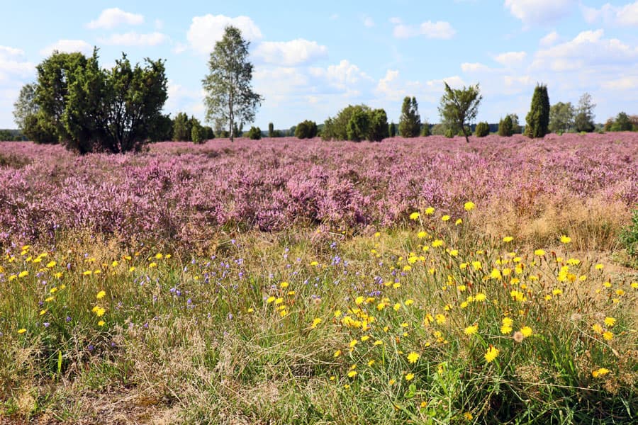 Schmarbeck mit seiner flächendeckenden Heideblüte. Die geschwungenen Sandpfade führen durch das lila Blütenmeer, vorbei an knorrigen Wacholdern und weiß leuchtenden Birken. Die Bienen summen geschäftig und der leichte Wind trägt süßlichen Heideduft herbei, der schon an den köstlichen Heideblütenhonig erinnert.