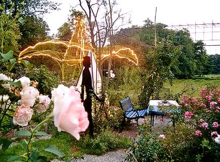 Die Gartenanlage bildet ein Zusammenspiel zwischen einem Feuchtbiotop, vom plätschernden Arteserbrunnen gespeist, und den harmonisch eingefügten Kunstobjekten. Der Aufenthalt auf einer der vier Terrassen verführt zu meditativen Gedankenspielen, die Wege aus dem Alltag öffnen.