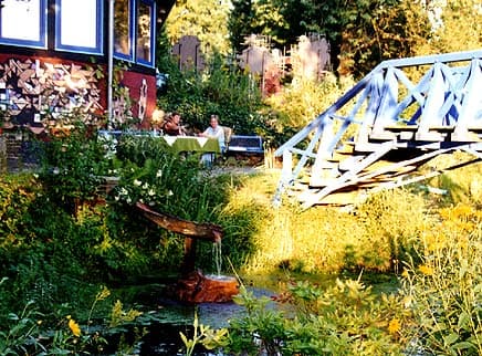 Zur anderen Seite grenzt er direkt an ein hölzernes Wehr des Heidebaches Wietze. Eine artesische Quelle speist ein 200 m2 großes “Sumpfloch“, in dem Frösche und Molche zu beobachten sind. Kaffee oder Tee kann im sechseckigen Pavillon – auch eine Eigenkreation – oder auf einer der vier Terrassen eingenommen werden – eine schwierige Wahl.