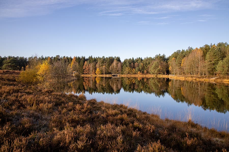Wandern durch den Naturpark Südheide auf der Heideschleife Angelbecksteich. Der See ist ein Höhepunkt des Wanderweges.Heideschleife Angelbecksteich