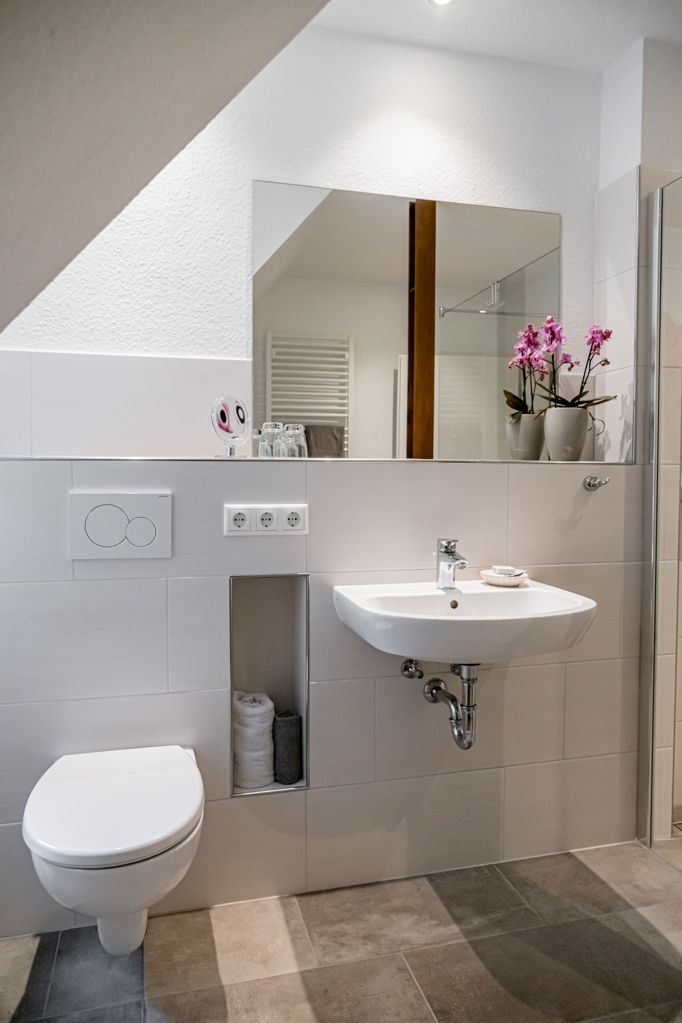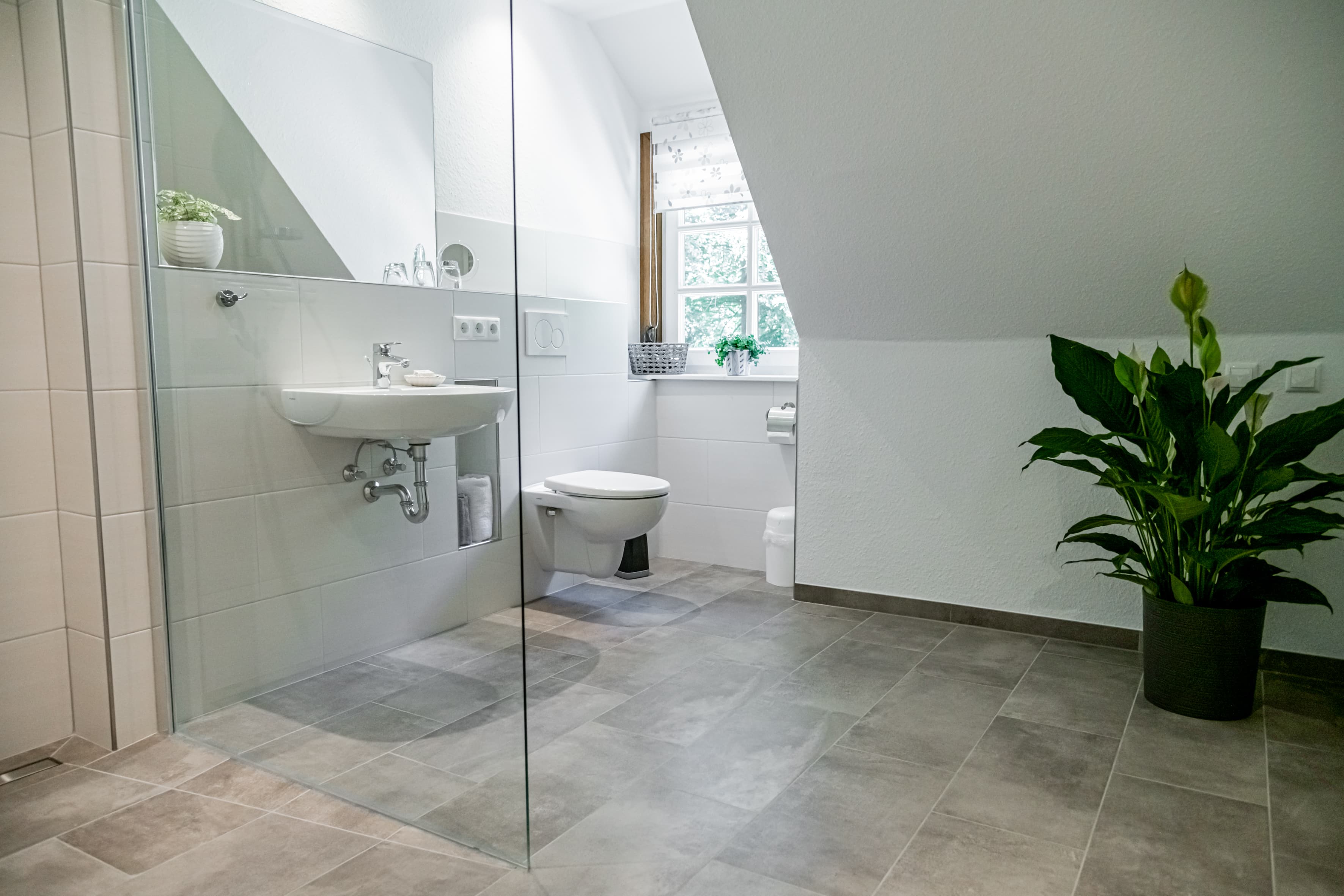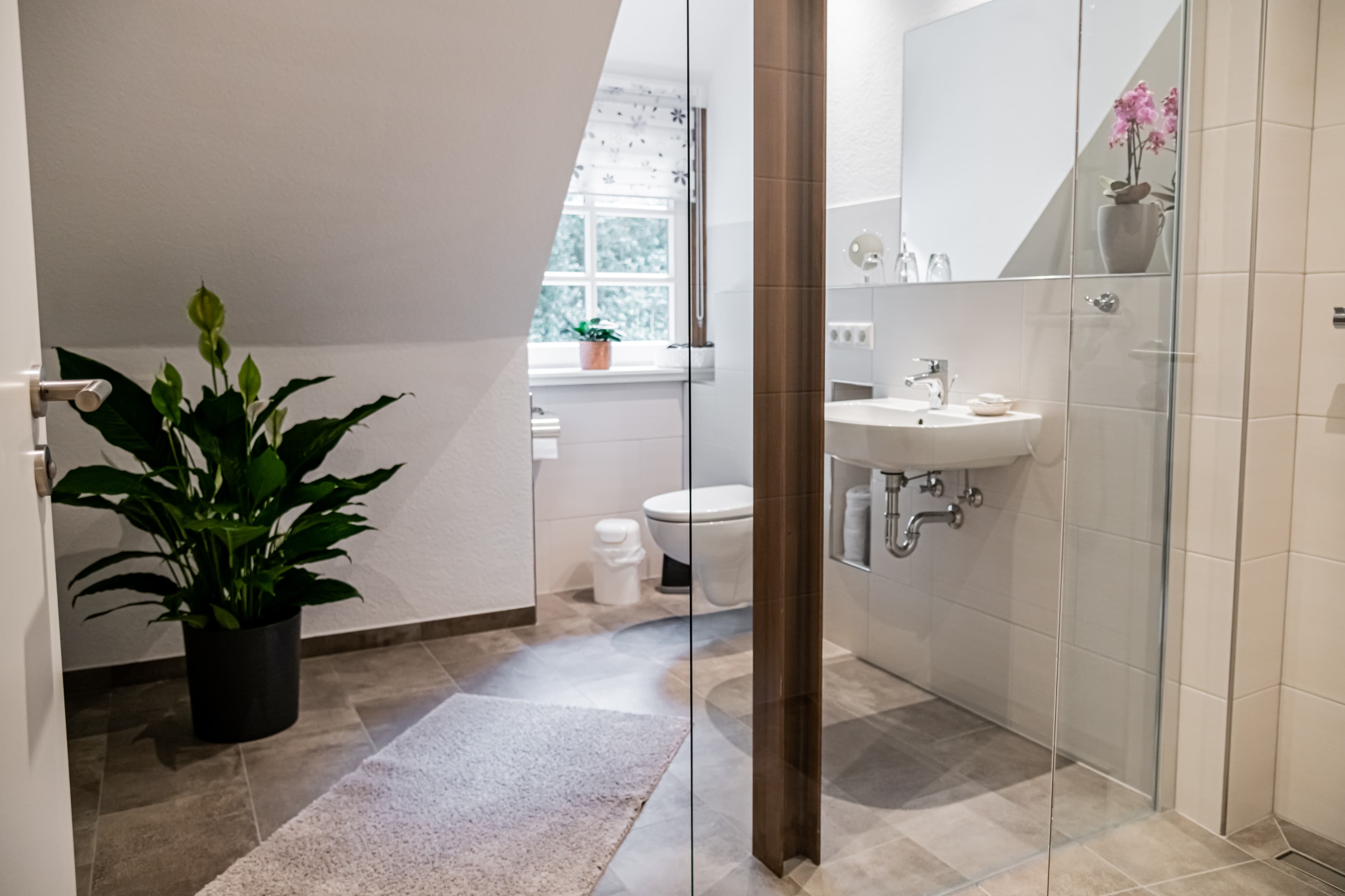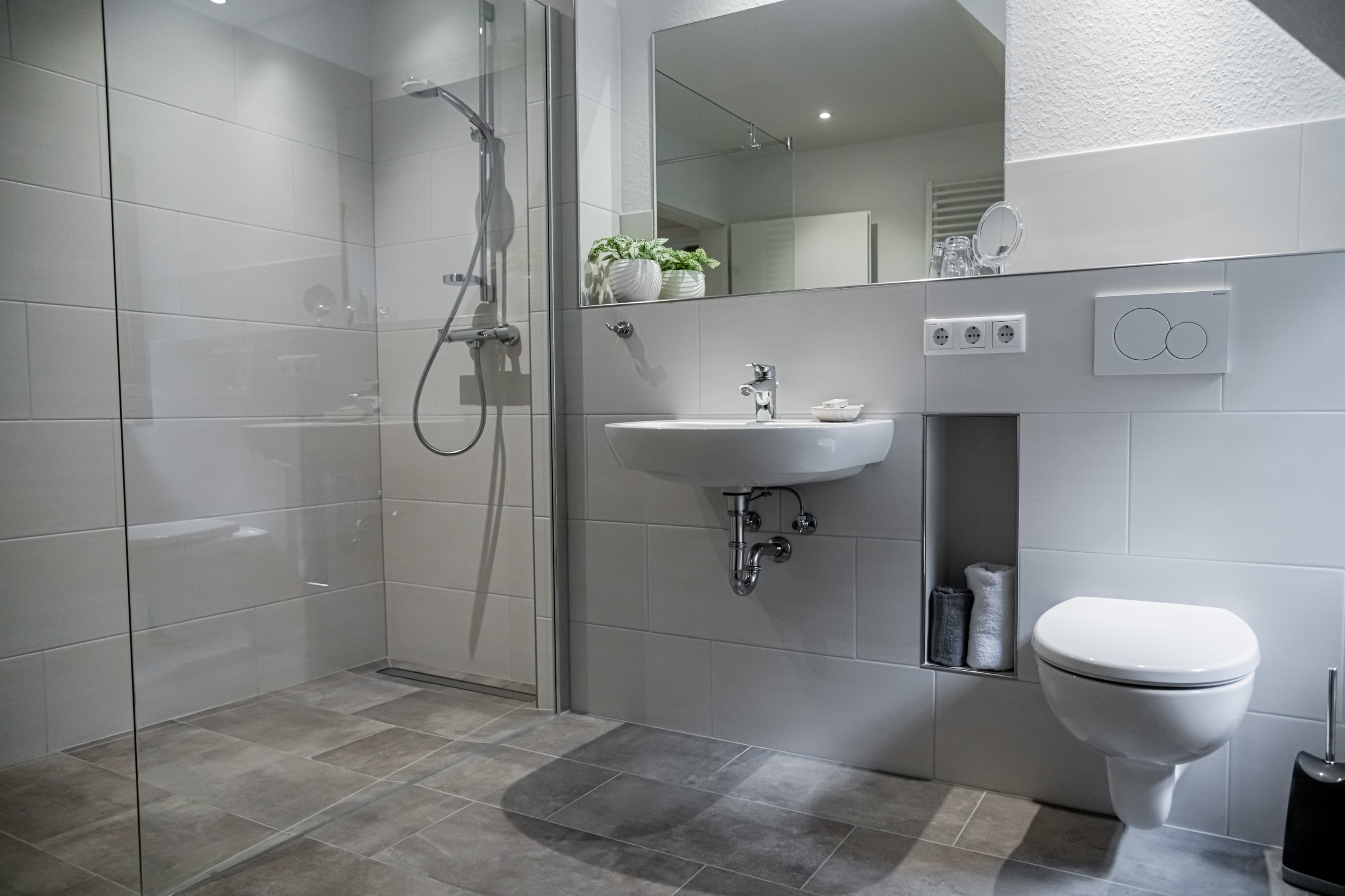 - modern ausgestattetes Bad mit Dusche, WC, Fußbodenheizung