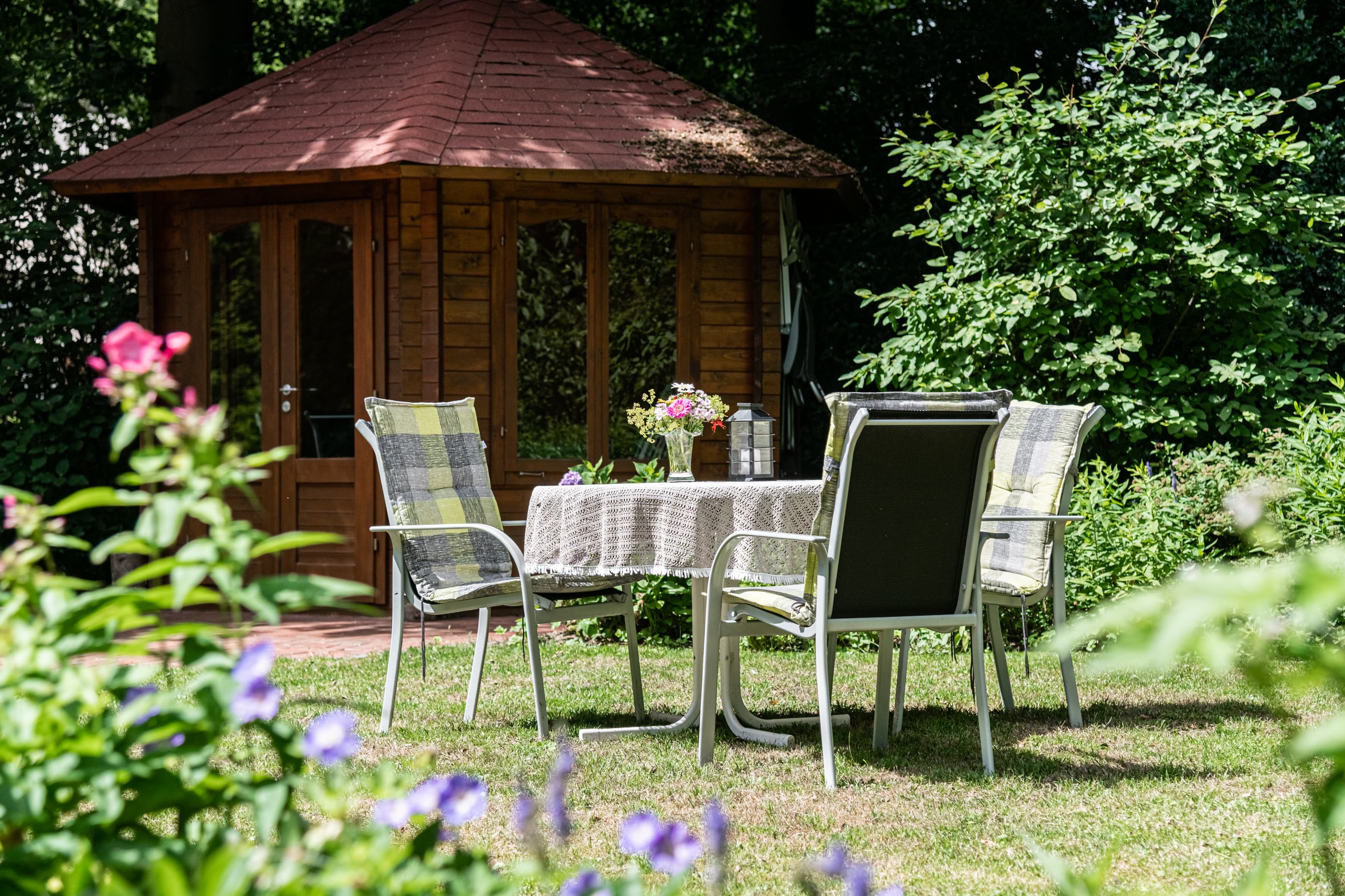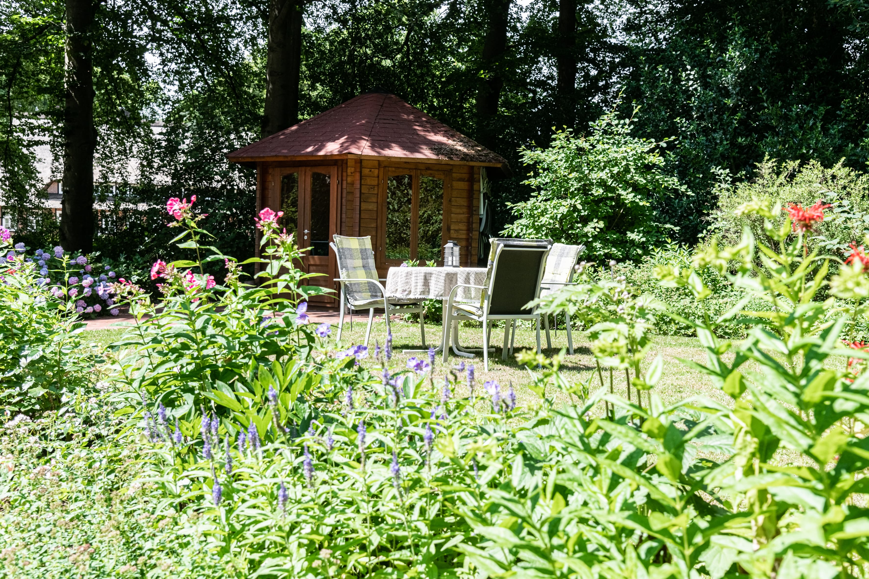 - Naturnaher und artenreicher Garten mit Sitzgelegenheiten.